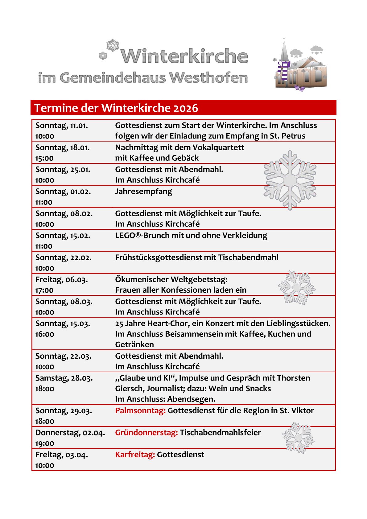 Vor allem um Heizenergie zu sparen rücken wir seit einigen Jahren zwischen Jahresanfang und Ostern im Gemeindehaus zusammen. Alle Gottesdienste, Friedensgebete und Passionsandachten finden im großen Saal statt. Wir erproben aber auch neue Formate. (Bitte beachten Sie die unterschiedlichen Anfangszeiten.)